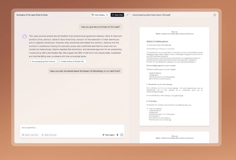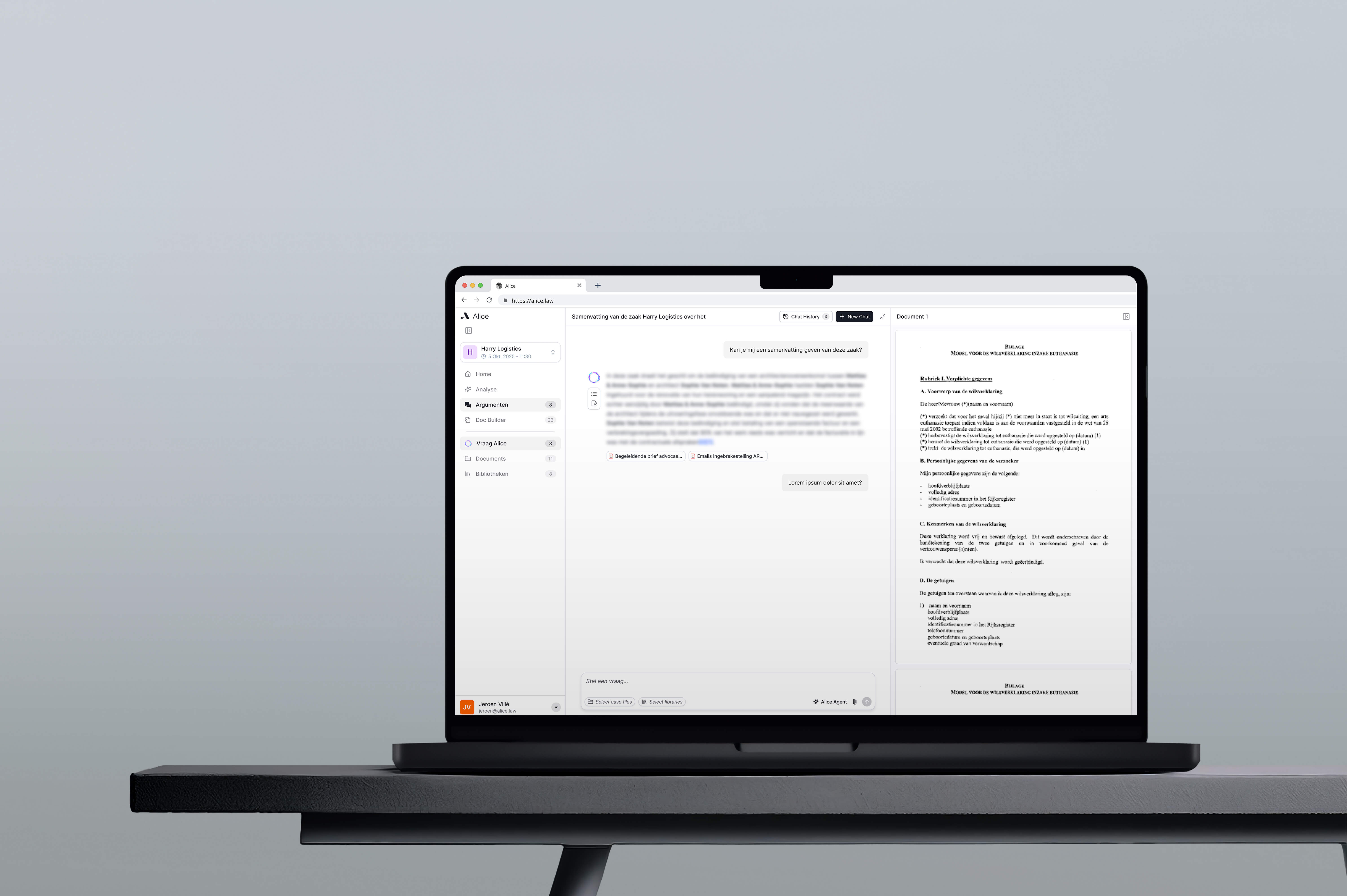Alice automatically transforms case files into structured insights - instantly analysing, researching relevant law and case law, and integrating the results directly into the lawyer’s daily workflow