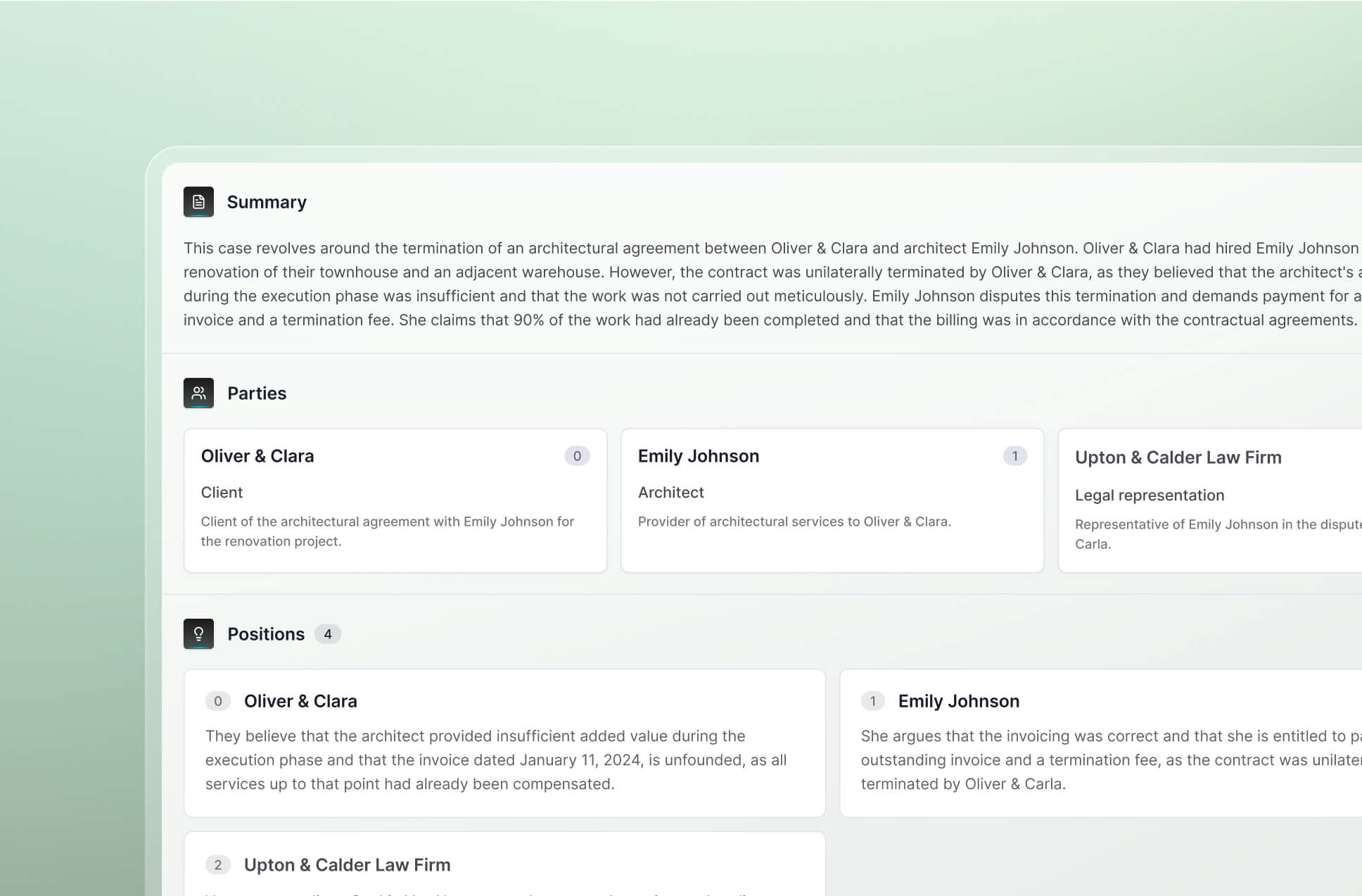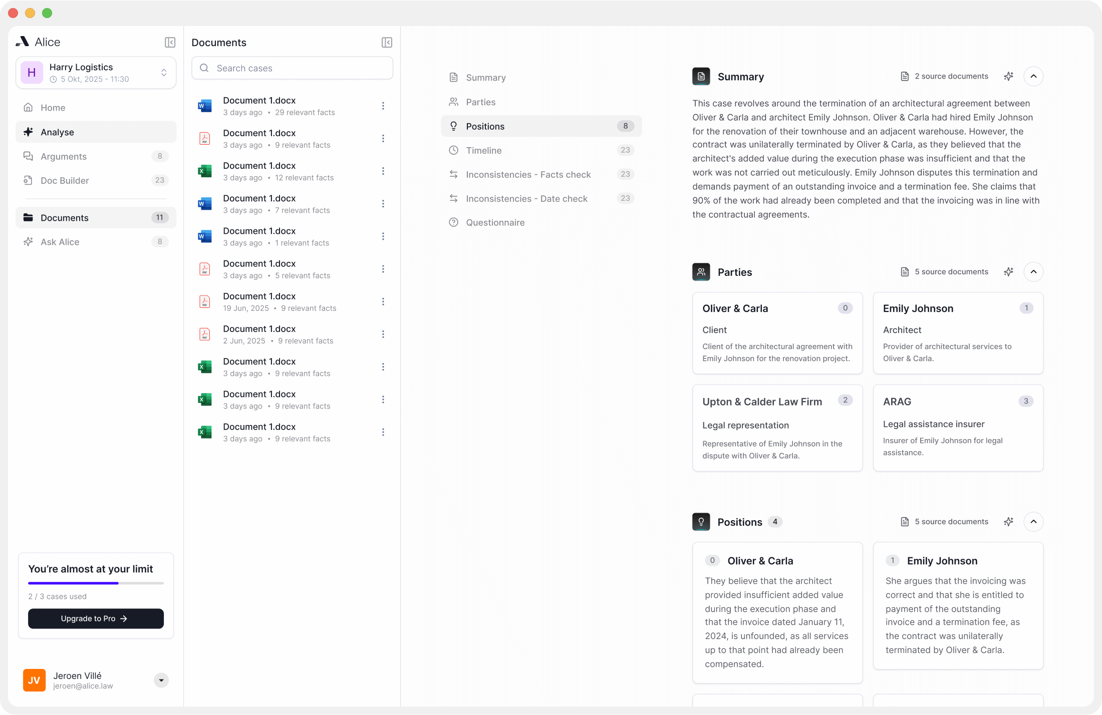 Alice analyseert automatisch je dossierstukken, herkent feiten, standpunten en partijen, en legt verbanden tussen documenten. Zo krijg je in enkele seconden helder inzicht in de kern van je dossier.