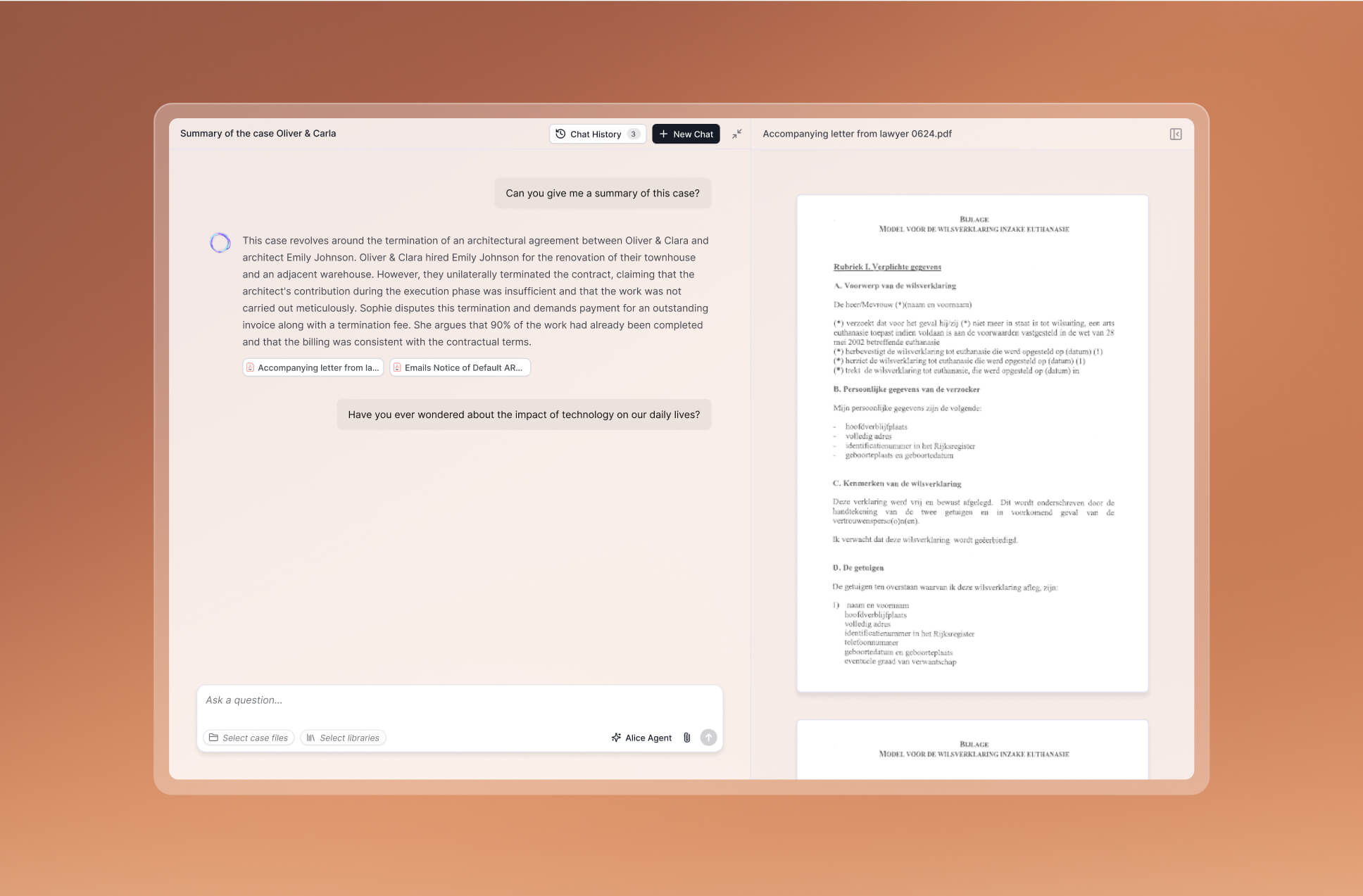 Met Alice stel je juridische documenten op - van advies en ingebrekestelling tot dagvaarding en conclusie. Gebouwd op feiten en juridische bronnen, gefinaliseerd in Word waar AI-efficiëntie samenkomt met de expertise van de advocaat.